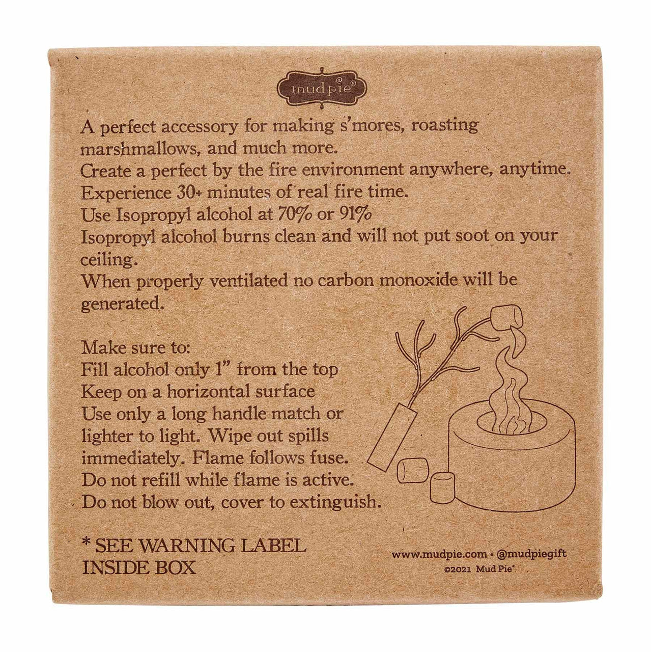 Our marshmallow roasting set is the perfect accessory for making s'mores, roasting marshmallows and more. The two piece set comes with a concrete table top mini fire pit. The fire pit comes with a wood and metal wire roasting skewer. Isopropyl Alcohol fuels the fire. The pit comes with detailed use instructions. Adult supervision required.